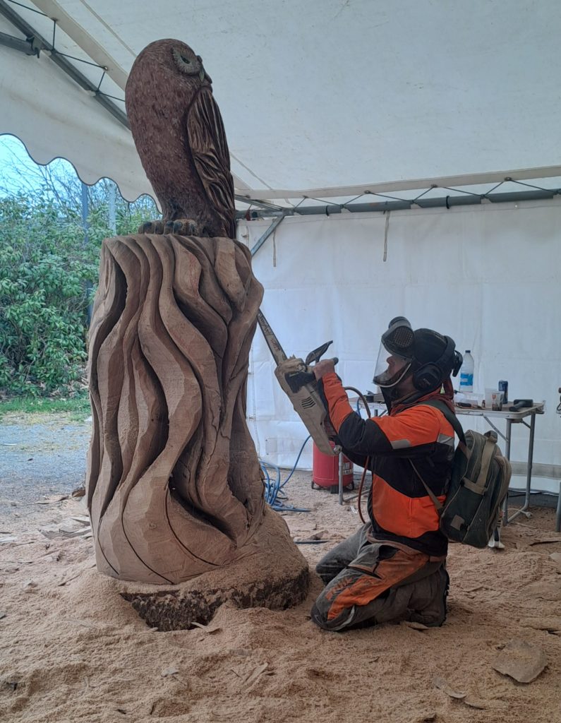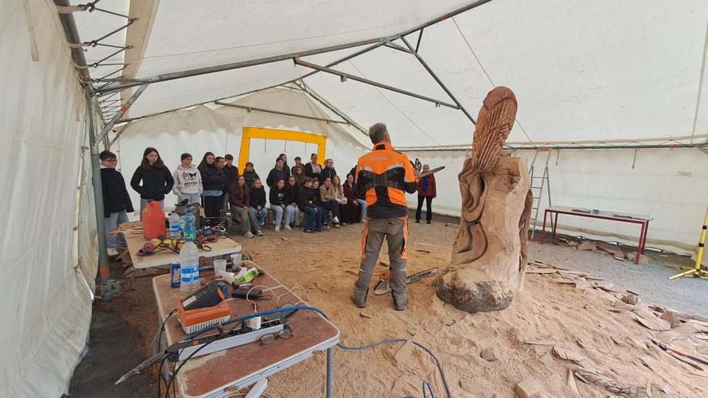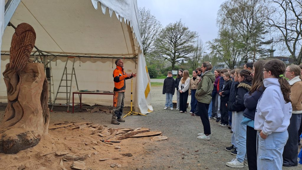 Sur les bords du plan d’eau, un sculpteur sur bois s’est installé le temps d’une création commandée par la Mairie de Plémet, L’ensemble des élèves sont allés le rencontrer. Ils ont pu lui poser des questions et le regarder manier les différentes tronçonneuses qu’il utilise et admirer son travail !